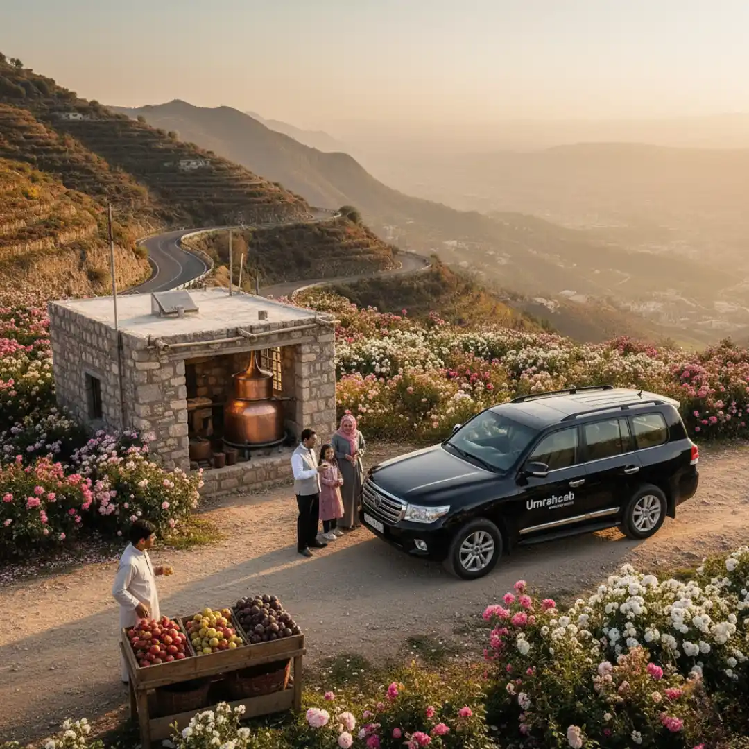 We begin with the thrilling and scenic drive up the mountain road. Our first stop is a traditional , where you can learn about the distillation of the famous Taif rose oil (attar) and rose water.