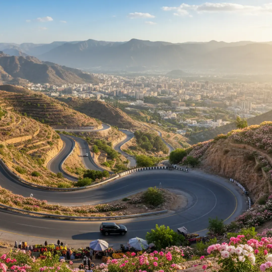Escape to the cool, fragrant highlands of Taif, affectionately known as the “City of Roses” and Saudi Arabia’s unofficial summer capital. Perched high in the Sarawat Mountains, Taif is a refreshing world away from the desert heat, offering verdant landscapes, aromatic rose fields, bustling fruit markets, and a rich historical tapestry.