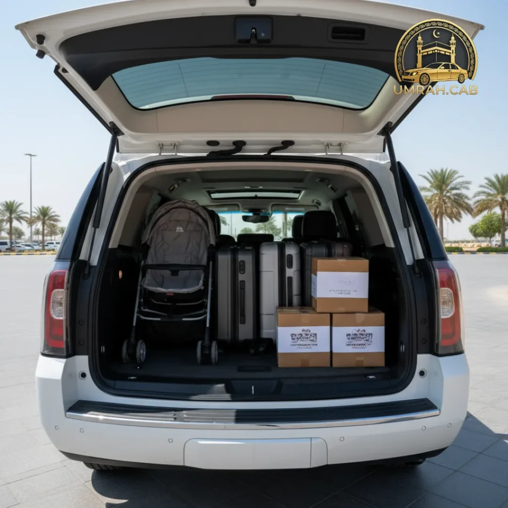A: Our GMC Yukon and similar SUVs can typically hold 5-7 large suitcases. On the return journey to the airport, they can accommodate a combination of several suitcases and multiple standard-sized Zamzam water boxes.